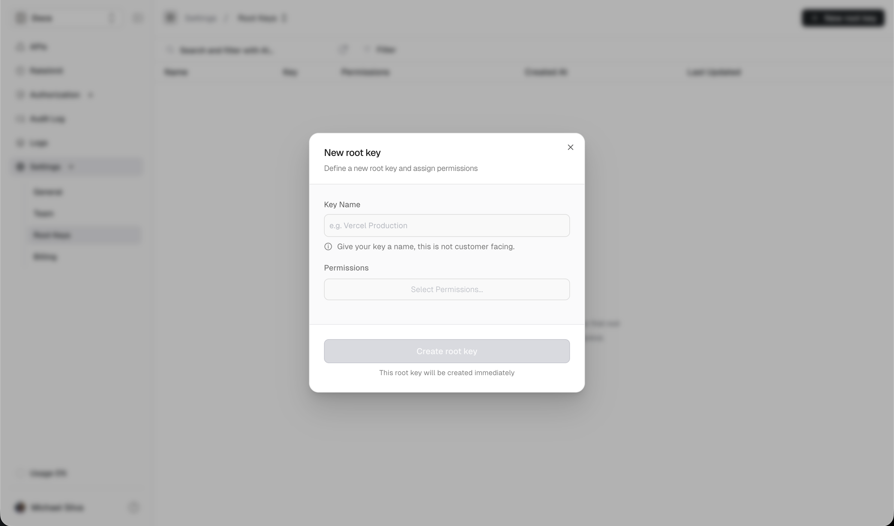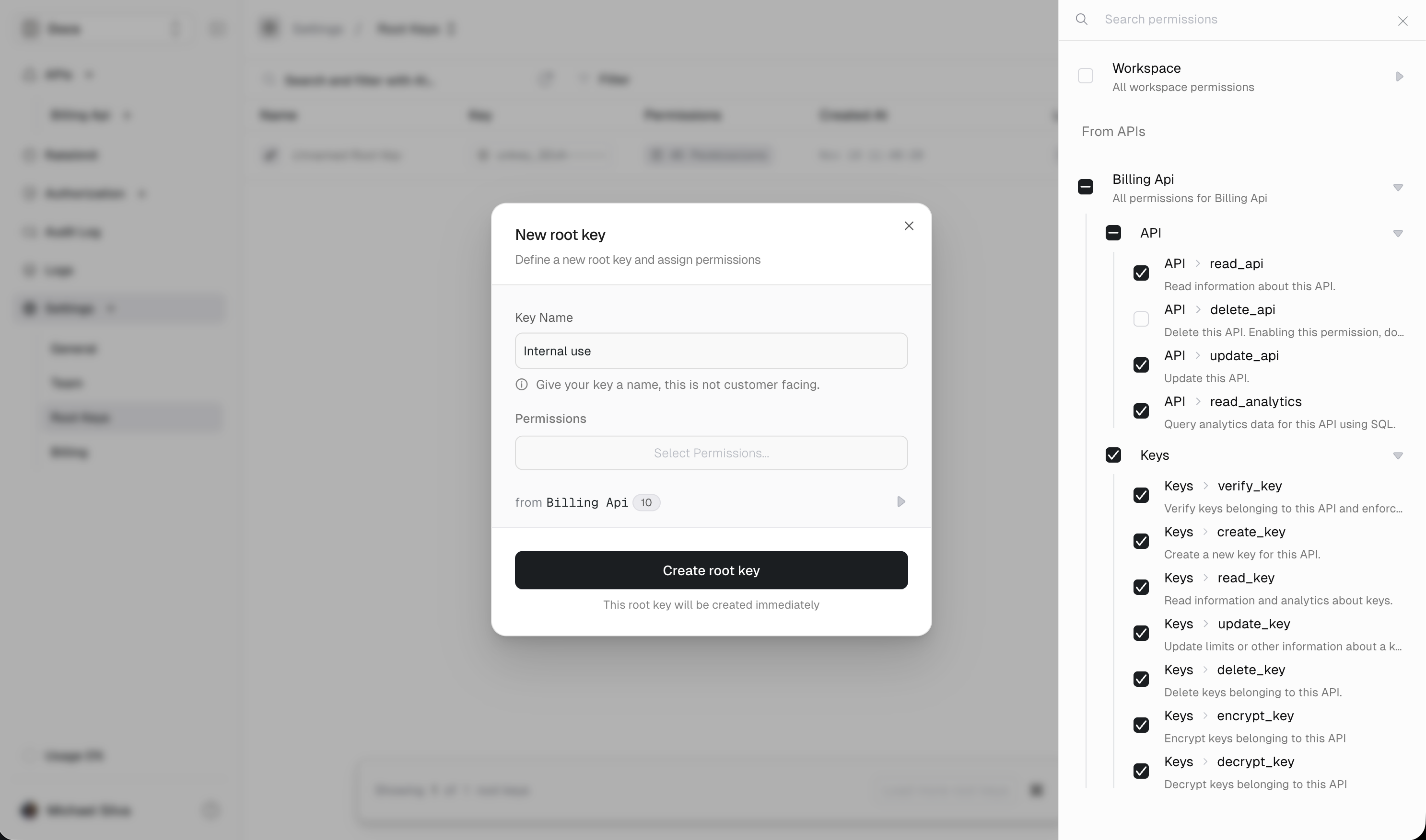 To interact with the Unkey API to manage resources such as APIs or keys, you need a root key. Root keys are scoped per workspace and you can fine tune their access permissions when creating a key or update later on the fly.